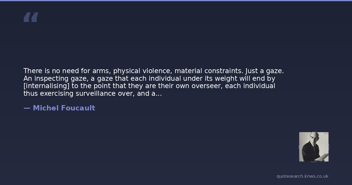 There is no need for arms, physical violence, material constraints. Just a gaze. An inspecting gaze, a gaze that each individual under its weight will end by [internalising] to the point that they are their own overseer, each individual thus exercising surveillance over, and against themself.