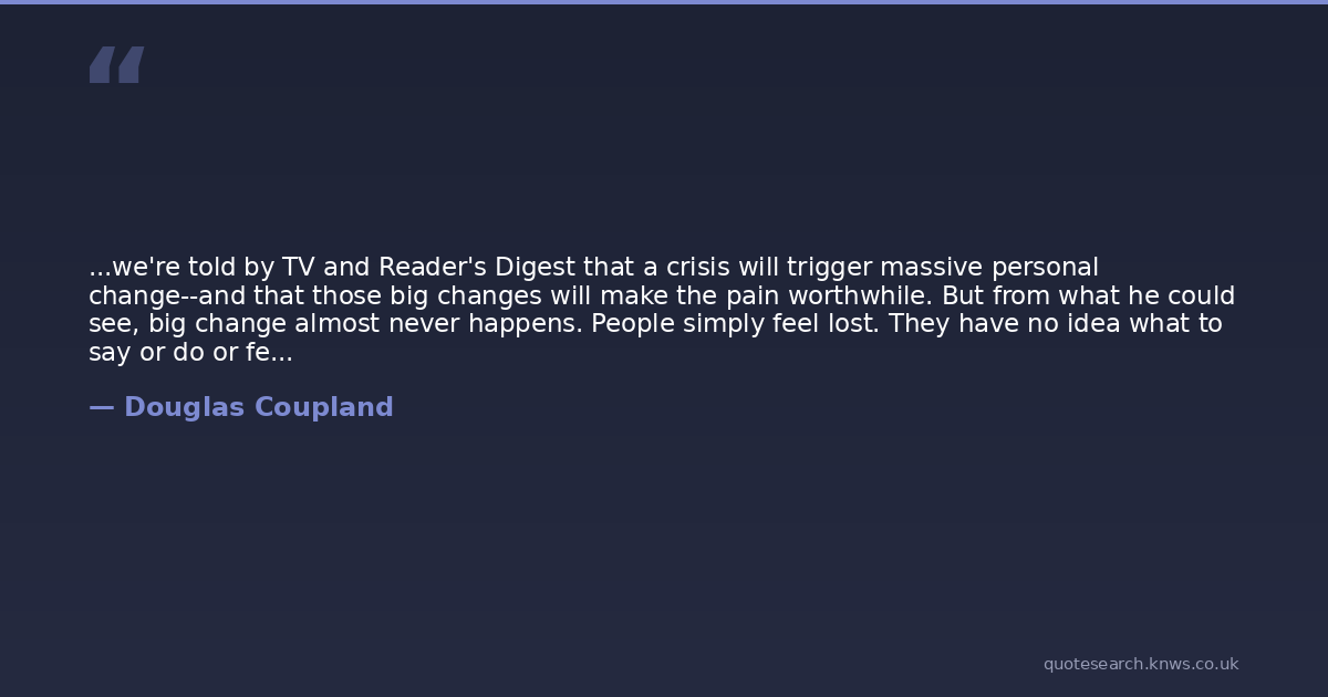 ...we're told by TV and Reader's Digest that a crisis will trigger massive personal change--and that those big changes will make the pain worthwhile. But from what he could see, big change almost never happens. People simply feel lost. They have no idea what to say or do or feel or think. they become messes and tend to remain messes.