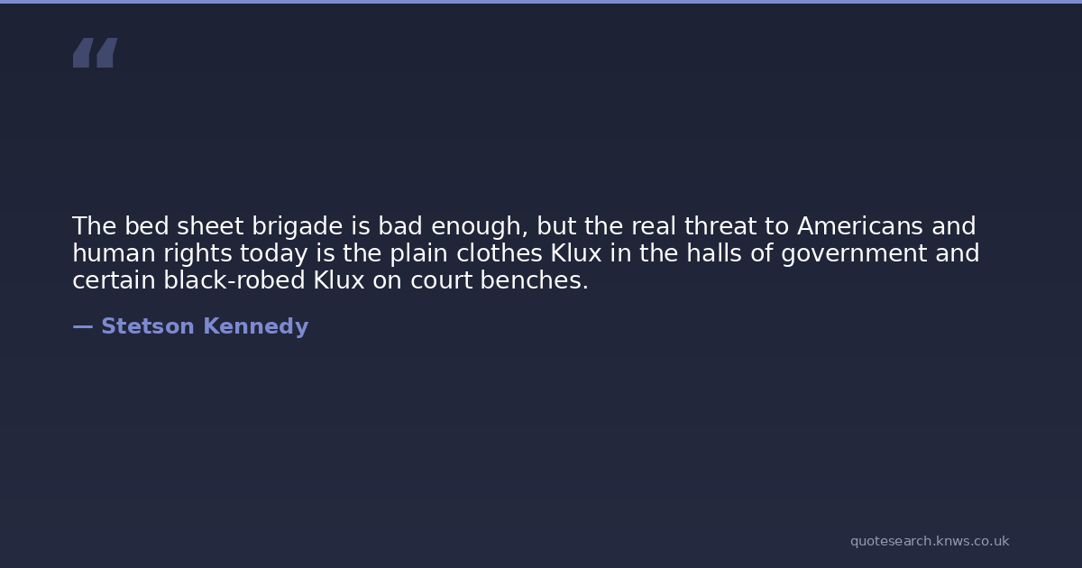 The bed sheet brigade is bad enough, but the real threat to Americans and human rights today is the plain clothes Klux in the halls of government and certain black-robed Klux on court benches.