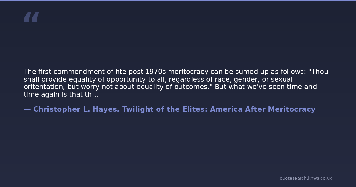 The first commendment of hte post 1970s meritocracy can be sumed up as follows: "Thou shall provide equality of opportunity to all, regardless of race, gender, or sexual oritentation, but worry not about equality of outcomes." But what we've seen time and time again is that the two aren't so neatly separated. If you don't concern yourself at all with equality fo outcomes, you will, over time, produce a system with horrendous inequality of opportunity. This is the paradox of meritocracy: It can only truly come to flower in a society that starts out with a relatively high degree of equality. So if you want meritocracy, work for equality. Because it is only in a society which values equality of actual outcomes, one that promotes the commonweal and social solidarity, that equal opportunity and earned mobility can flourish.