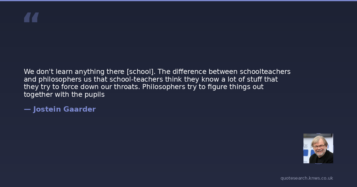 We don't learn anything there [school]. The difference between schoolteachers and philosophers us that school-teachers think they know a lot of stuff that they try to force down our throats. Philosophers try to figure things out together with the pupils