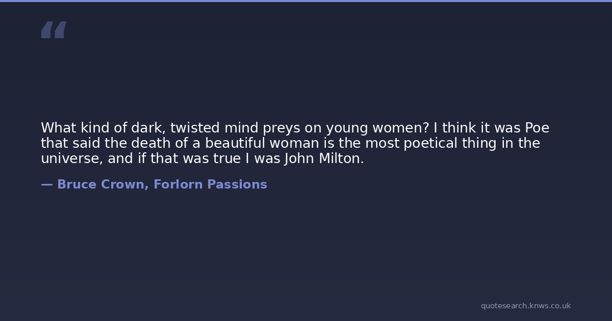 What kind of dark, twisted mind preys on young women? I think it was Poe that said the death of a beautiful woman is the most poetical thing in the universe, and if that was true I was John Milton.