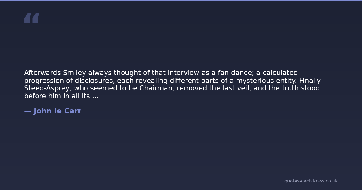 Afterwards Smiley always thought of that interview as a fan dance; a calculated progression of disclosures, each revealing different parts of a mysterious entity. Finally Steed-Asprey, who seemed to be Chairman, removed the last veil, and the truth stood before him in all its dazzling nakedness. He was being offered a post in what, for want of a better name, Steed-Asprey blushingly described as the Secret Service.