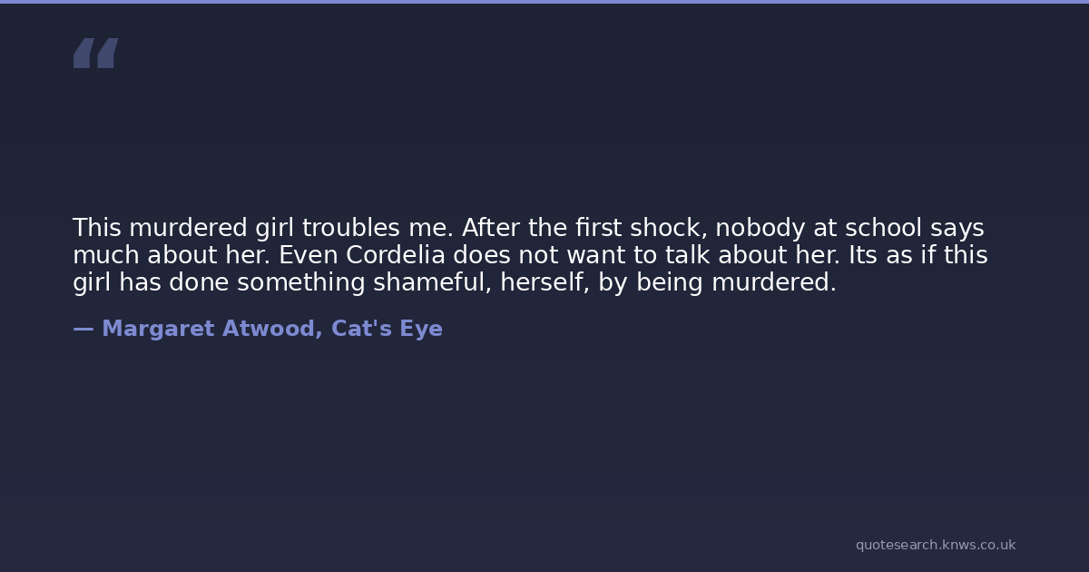 This murdered girl troubles me. After the first shock, nobody at school says much about her. Even Cordelia does not want to talk about her. Its as if this girl has done something shameful, herself, by being murdered.