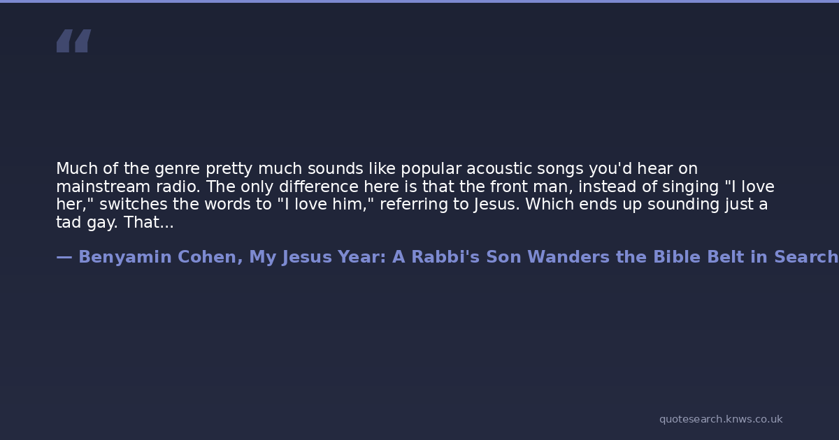 Much of the genre pretty much sounds like popular acoustic songs you'd hear on mainstream radio. The only difference here is that the front man, instead of singing "I love her," switches the words to "I love him," referring to Jesus. Which ends up sounding just a tad gay. That irony is apparently lost on this spiritual set.