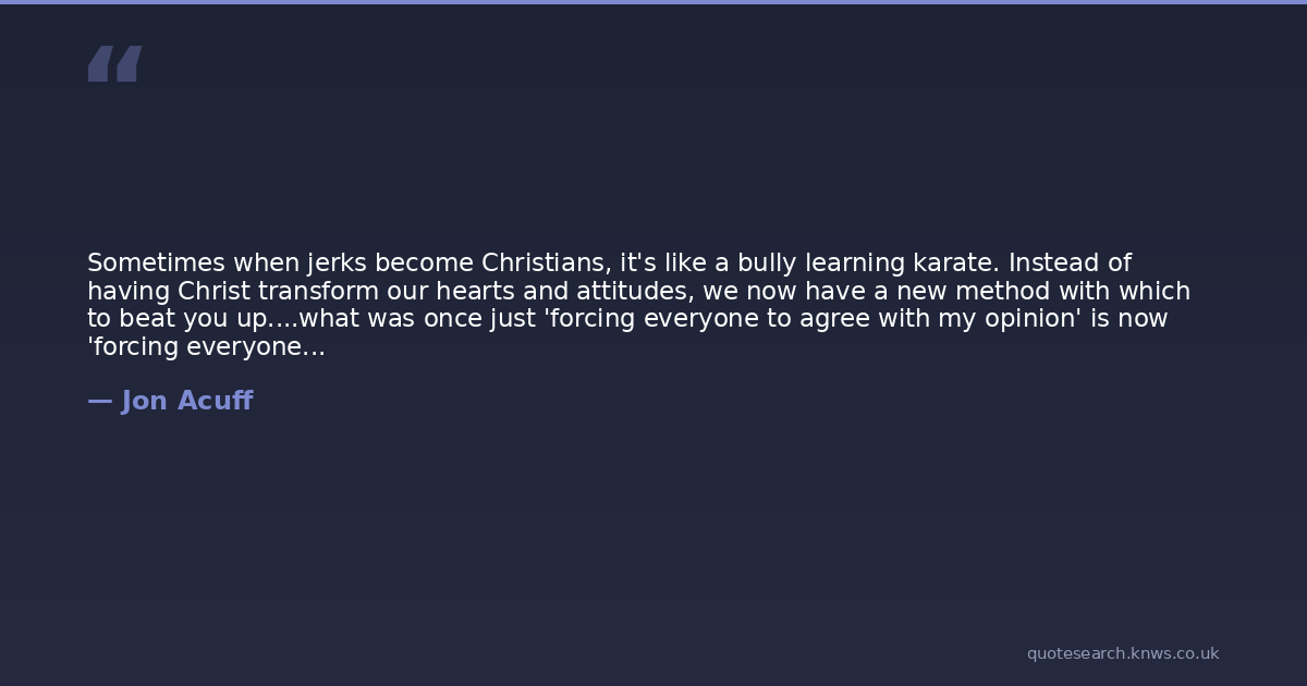 Sometimes when jerks become Christians, it's like a bully learning karate. Instead of having Christ transform our hearts and attitudes, we now have a new method with which to beat you up....what was once just 'forcing everyone to agree with my opinion' is now 'forcing everyone to agree with my opinion in the name of God.