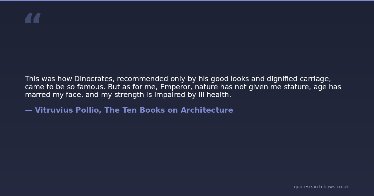 This was how Dinocrates, recommended only by his good looks and dignified carriage, came to be so famous. But as for me, Emperor, nature has not given me stature, age has marred my face, and my strength is impaired by ill health.