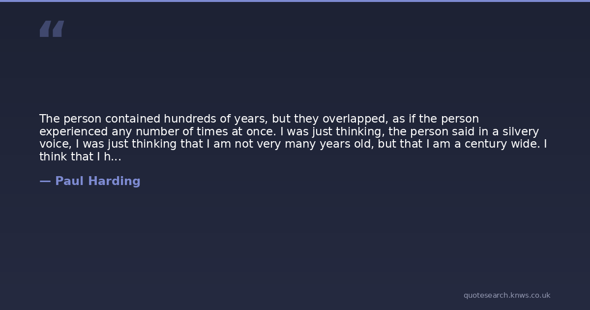 The person contained hundreds of years, but they overlapped, as if the person experienced any number of times at once. I was just thinking, the person said in a silvery voice, I was just thinking that I am not very many years old, but that I am a century wide. I think that I have my literal age but am surrounded in a radius of years. I think that these years of days, this near century of years, is a gift from you. Thank you.