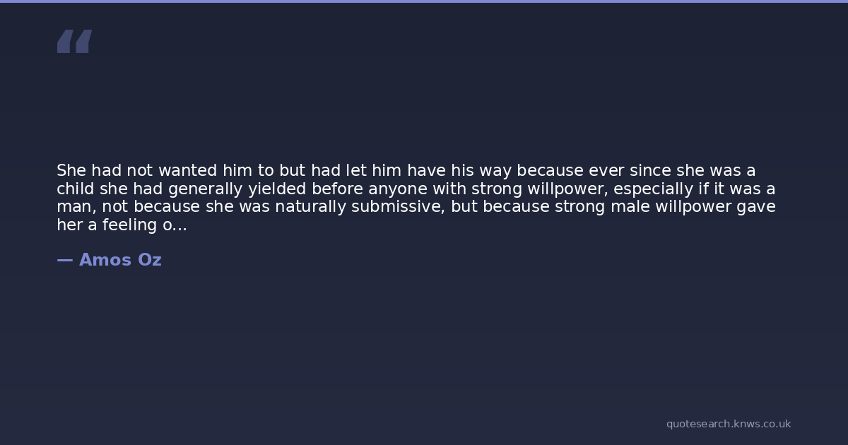 She had not wanted him to but had let him have his way because ever since she was a child she had generally yielded before anyone with strong willpower, especially if it was a man, not because she was naturally submissive, but because strong male willpower gave her a feeling of safety and trust, together with acceptance and a desire to give in.