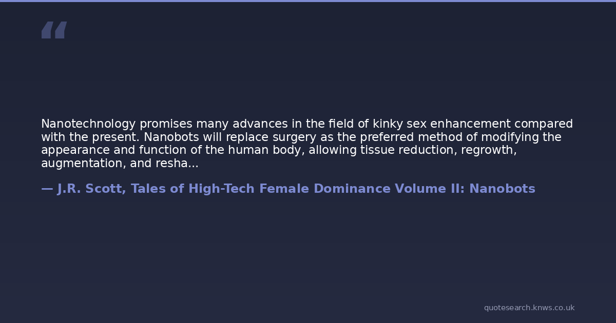 Nanotechnology promises many advances in the field of kinky sex enhancement compared with the present. Nanobots will replace surgery as the preferred method of modifying the appearance and function of the human body, allowing tissue reduction, regrowth, augmentation, and reshaping.