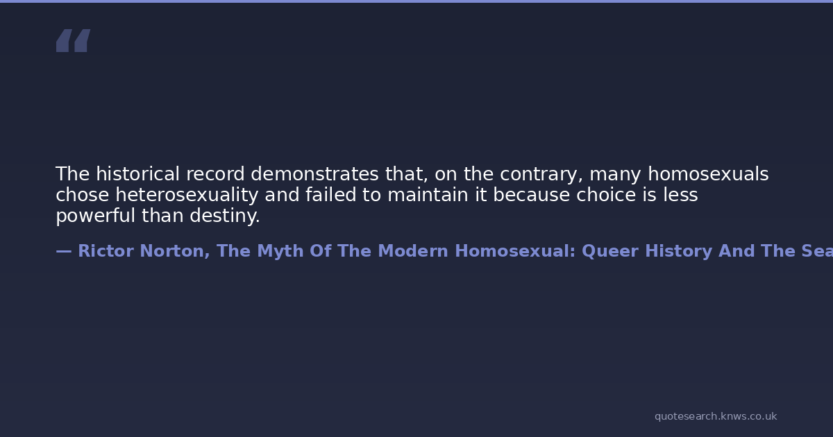 The historical record demonstrates that, on the contrary, many homosexuals chose heterosexuality and failed to maintain it because choice is less powerful than destiny.