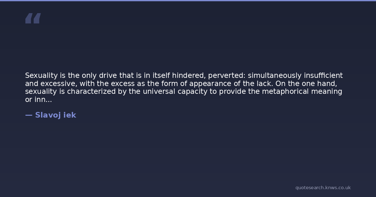 Sexuality is the only drive that is in itself hindered, perverted: simultaneously insufficient and excessive, with the excess as the form of appearance of the lack. On the one hand, sexuality is characterized by the universal capacity to provide the metaphorical meaning or innuendo of any activity or objectany element, including the most abstract reflection can be experienced as alluding to that (suffice it to recall the proverbial example of the adolescent who, in order to forget his sexual obsessions, takes refuge in pure mathematics and physicswhatever he does here again reminds him of that: how much volume is needed to fill out an empty cylinder? How much energy is discharged when two bodies collide?). The universal surplusthis capacity of sexuality to overflow the entire field of human experienceis not the sign of preponderance. Rather, it is the sign of a certain structural faultiness: sexuality strives outwards and overflows the adjoining domains precisely because it cannot find satisfaction in itself, because it never attains its goal.