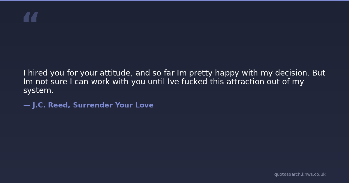 I hired you for your attitude, and so far Im pretty happy with my decision. But Im not sure I can work with you until Ive fucked this attraction out of my system.