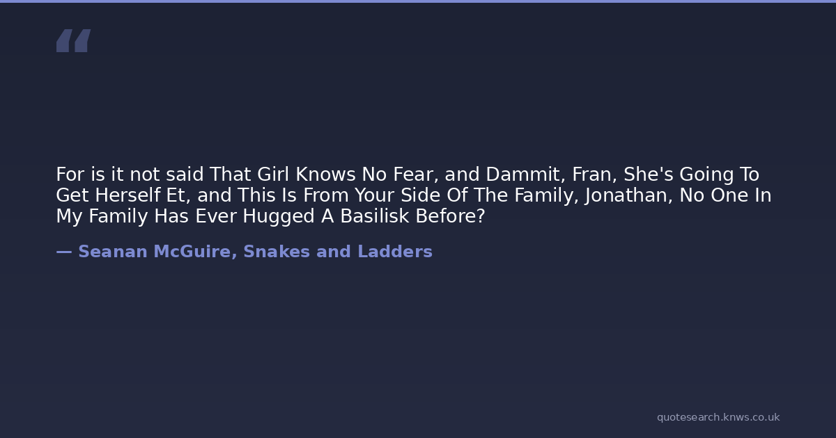 For is it not said That Girl Knows No Fear, and Dammit, Fran, She's Going To Get Herself Et, and This Is From Your Side Of The Family, Jonathan, No One In My Family Has Ever Hugged A Basilisk Before?