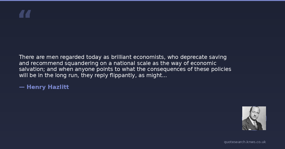 There are men regarded today as brilliant economists, who deprecate saving and recommend squandering on a national scale as the way of economic salvation; and when anyone points to what the consequences of these policies will be in the long run, they reply flippantly, as might the prodigal son of a warning father: "In the long run we are all dead." And such shallow wisecracks pass as devastating epigrams and the ripest wisdom.