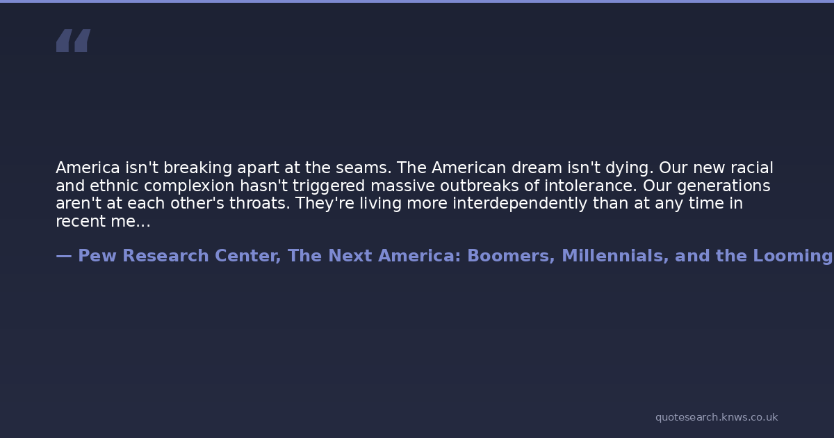 America isn't breaking apart at the seams. The American dream isn't dying. Our new racial and ethnic complexion hasn't triggered massive outbreaks of intolerance. Our generations aren't at each other's throats. They're living more interdependently than at any time in recent memory, because that turns out to be a good coping strategy in hard times. Our nation faces huge challenges, no doubt. So do the rest of the world's aging economic powers. If you had to pick a nation with the right stuff to ride out the coming demographic storm, you'd be crazy not to choose America, warts and all.