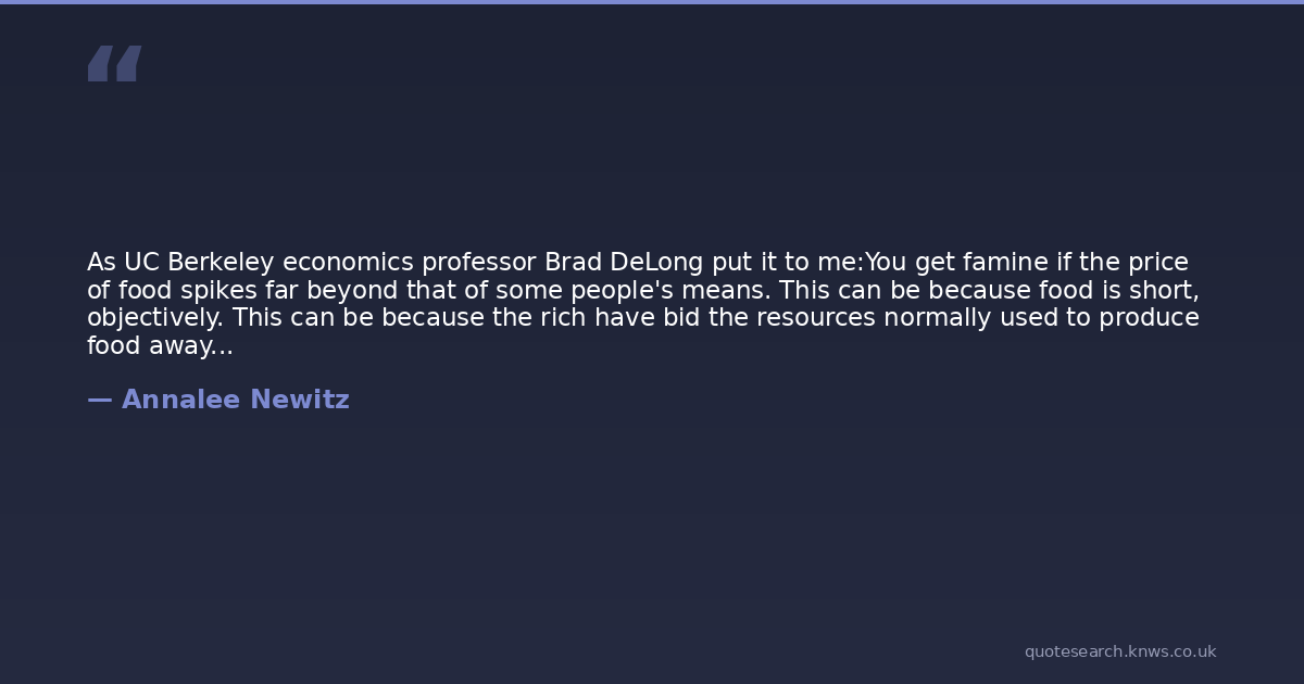 As UC Berkeley economics professor Brad DeLong put it to me:You get famine if the price of food spikes far beyond that of some people's means. This can be because food is short, objectively. This can be because the rich have bid the resources normally used to produce food away to other uses. You also get famine when the price of food is moderate if the incomes of large groups collapse.... In all of this, the lesson is that a properly functioning market does not seek to advance human happiness but rather to advance human wealth. What speaks in the market is money: purchasing power. If you have no money, you have no voice in the market. The market acts as if it does not know you exist and does not care whether you live or die.DeLong describes a marketplace that leaves people to die - not out of malice , but out of indifference.