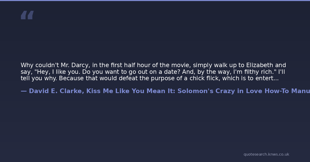 Why couldn't Mr. Darcy, in the first half hour of the movie, simply walk up to Elizabeth and say, "Hey, I like you. Do you want to go out on a date? And, by the way, I'm filthy rich." I'll tell you why. Because that would defeat the purpose of a chick flick, which is to entertain women and torture men.