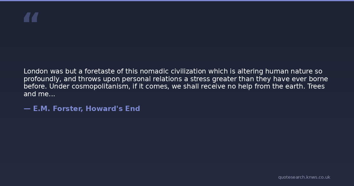 London was but a foretaste of this nomadic civilization which is altering human nature so profoundly, and throws upon personal relations a stress greater than they have ever borne before. Under cosmopolitanism, if it comes, we shall receive no help from the earth. Trees and meadows and mountains will only be a spectacle, and the binding force that once exercised on character must be entrusted to Love alone. May Love be equal to the task!