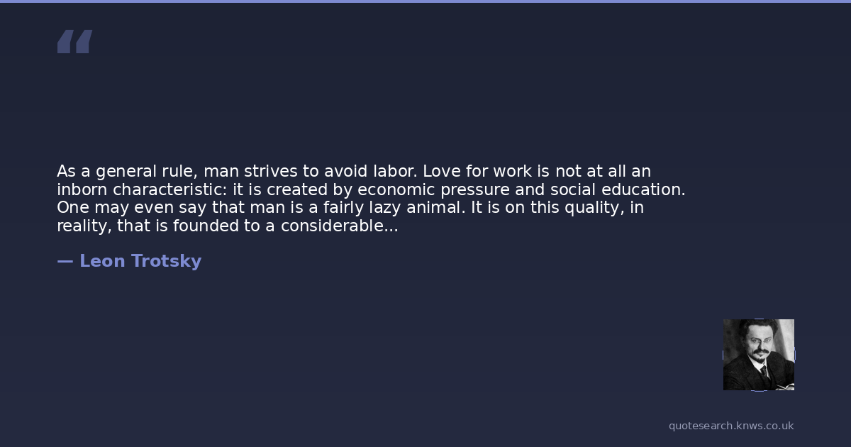 As a general rule, man strives to avoid labor. Love for work is not at all an inborn characteristic: it is created by economic pressure and social education. One may even say that man is a fairly lazy animal. It is on this quality, in reality, that is founded to a considerable extent all human progress; because if man did not strive to expend his energy economically, did not seek to receive the largest possible quantity of products in return for a small quantity of energy, there would have been no technical development or social culture.