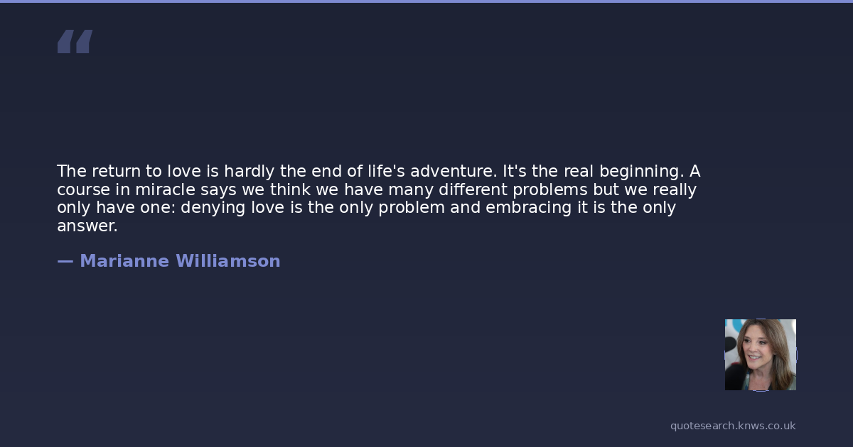 The return to love is hardly the end of life's adventure. It's the real beginning. A course in miracle says we think we have many different problems but we really only have one: denying love is the only problem and embracing it is the only answer.