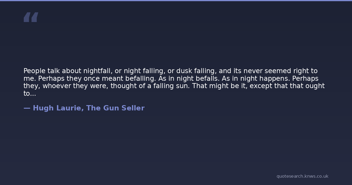 People talk about nightfall, or night falling, or dusk falling, and its never seemed right to me. Perhaps they once meant befalling. As in night befalls. As in night happens. Perhaps they, whoever they were, thought of a falling sun. That might be it, except that that ought to give us dayfall. Day fell on Rupert the Bear. And we know, if weve ever read a book, that day doesnt fall or rise. It breaks. In books, day breaks, and night falls.In life, night rises from the ground. The day hangs on for as long as it can, bright and eager, absolutely and positively the last guest to leave the party, while the ground darkens, oozing night around your ankles, swallowing for ever that dropped contact lens, making you miss that low catch in the gully on the last ball of the last over.