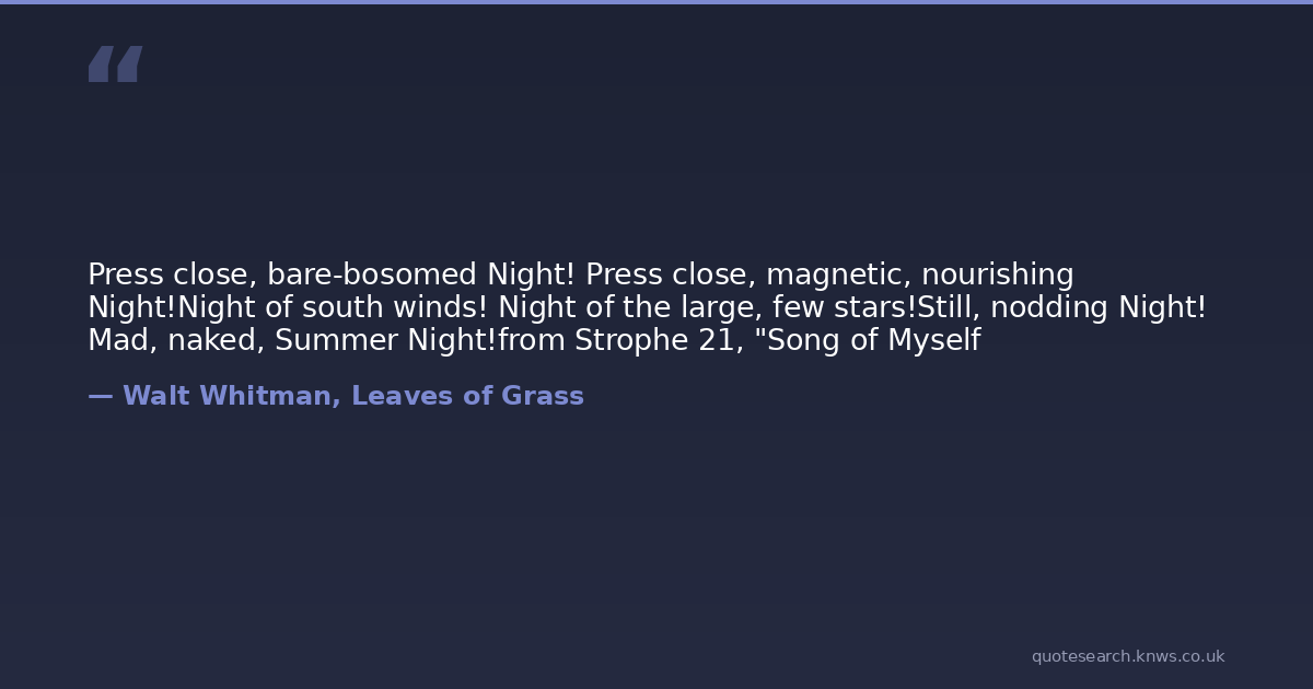 Press close, bare-bosomed Night! Press close, magnetic, nourishing Night!Night of south winds! Night of the large, few stars!Still, nodding Night! Mad, naked, Summer Night!from Strophe 21, "Song of Myself