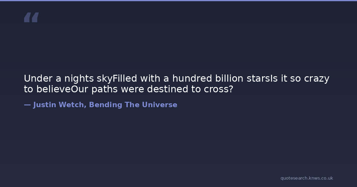 Under a nights skyFilled with a hundred billion starsIs it so crazy to believeOur paths were destined to cross?