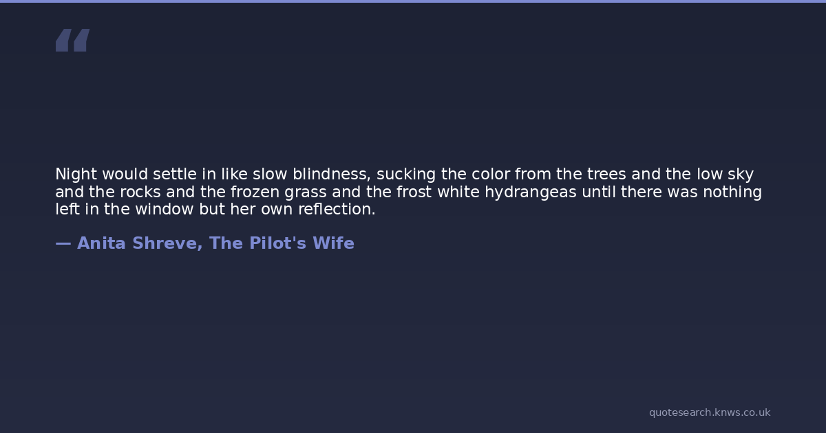 Night would settle in like slow blindness, sucking the color from the trees and the low sky and the rocks and the frozen grass and the frost white hydrangeas until there was nothing left in the window but her own reflection.