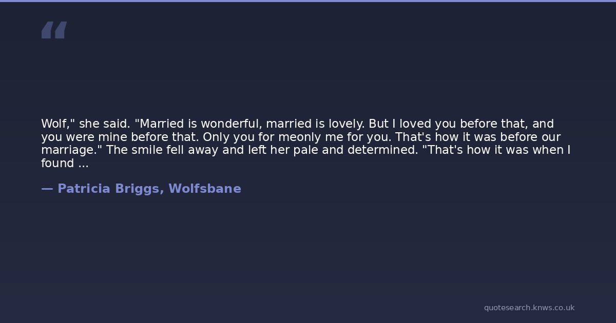 Wolf," she said. "Married is wonderful, married is lovely. But I loved you before that, and you were mine before that. Only you for meonly me for you. That's how it was before our marriage." The smile fell away and left her pale and determined. "That's how it was when I found you in that pit trap all those years agoI knew as soon as I first saw your eyes. But then, I've known all my life what love is. It took you, who had nothing to compare it to, rather longer to figure out, to understand what is between us. But even when you did not understand or recognize itit was always love.