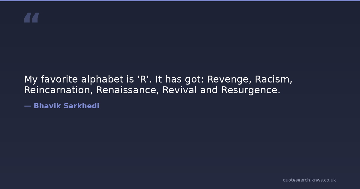 My favorite alphabet is 'R'. It has got: Revenge, Racism, Reincarnation, Renaissance, Revival and Resurgence.