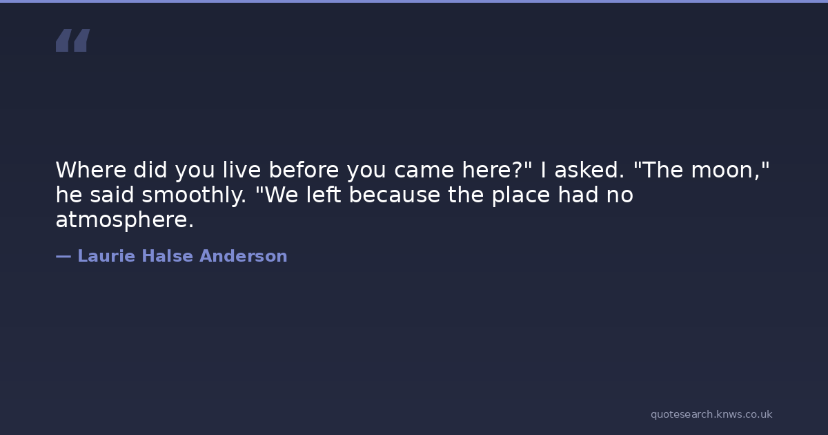 Where did you live before you came here?" I asked. "The moon," he said smoothly. "We left because the place had no atmosphere.