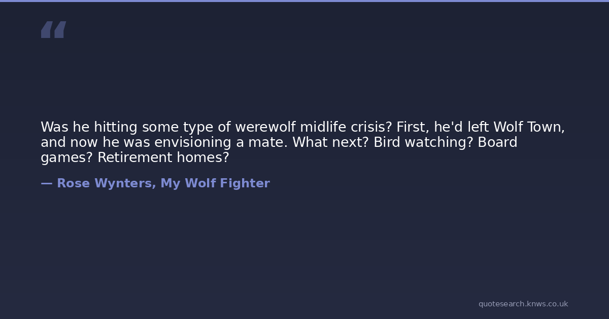 Was he hitting some type of werewolf midlife crisis? First, he'd left Wolf Town, and now he was envisioning a mate. What next? Bird watching? Board games? Retirement homes?
