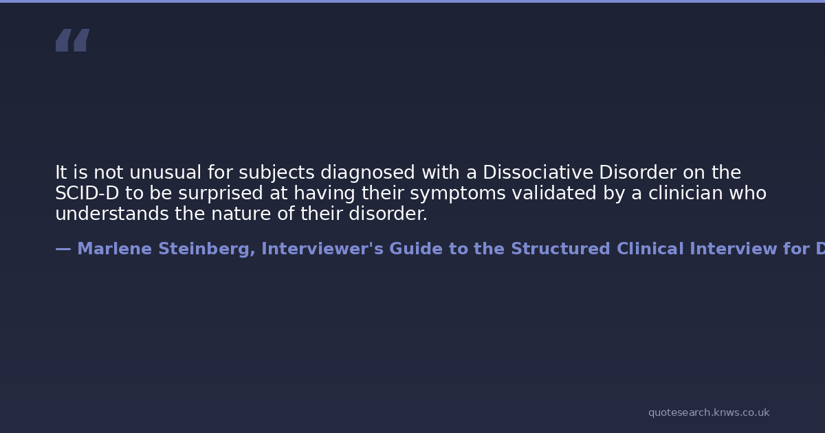 It is not unusual for subjects diagnosed with a Dissociative Disorder on the SCID-D to be surprised at having their symptoms validated by a clinician who understands the nature of their disorder.