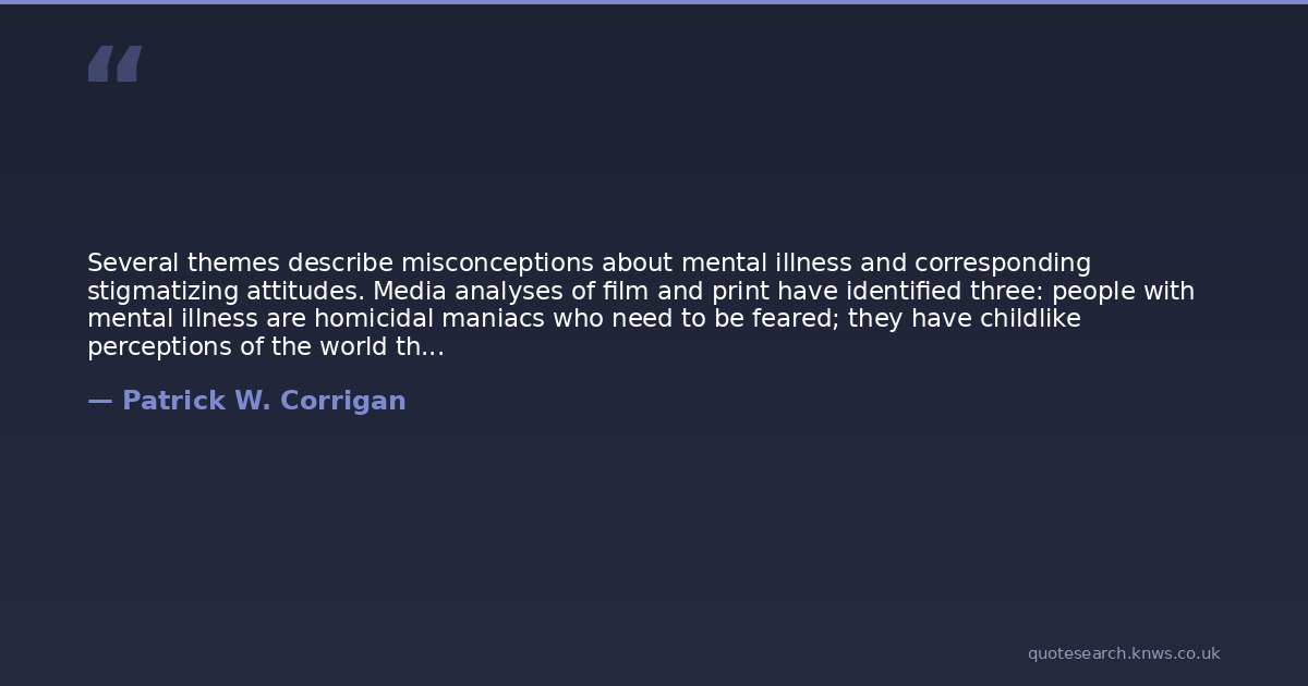 Several themes describe misconceptions about mental illness and corresponding stigmatizing attitudes. Media analyses of film and print have identified three: people with mental illness are homicidal maniacs who need to be feared; they have childlike perceptions of the world that should be marveled; or they are responsible for their illness because they have weak character (29-32)."World Psychiatry. 2002 Feb; 1(1): 1620.PMCID: PMC1489832Understanding the impact of stigma on people with mental illnessPATRICK W CORRIGAN and AMY C WATSON