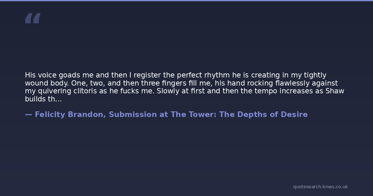 His voice goads me and then I register the perfect rhythm he is creating in my tightly wound body. One, two, and then three fingers fill me, his hand rocking flawlessly against my quivering clitoris as he fucks me. Slowly at first and then the tempo increases as Shaw builds the pace. Before I know it I am panting as the sensations consume me. Eyes shut tight, I feel myself grinding against what feels like the palm of his hand or maybe his wrist, loving the friction it creates as Shaw penetrates me over and over again.