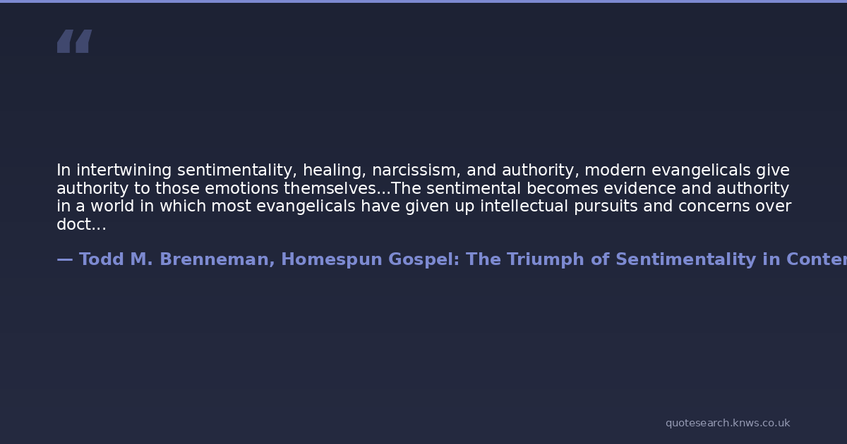 In intertwining sentimentality, healing, narcissism, and authority, modern evangelicals give authority to those emotions themselves...The sentimental becomes evidence and authority in a world in which most evangelicals have given up intellectual pursuits and concerns over doctrine. Essentially, sentimentality represents an abandonment of theology and critical introspection in popular evangelicalism. Instead of crafting intellectual responses to the challenges to evangelicalism, popular evangelicals appeal to the power of feeling as an authority to counteract science and criticism of the Bible. They offer their audiences the opportunity to FEEL that evangelicalism is right rather than asking them to accept the veracity of doctrinal positions of evangelicalism.