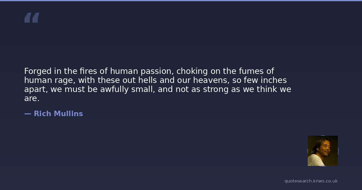 Forged in the fires of human passion, choking on the fumes of human rage, with these out hells and our heavens, so few inches apart, we must be awfully small, and not as strong as we think we are.