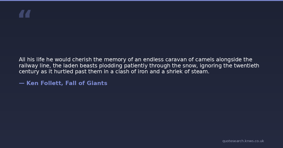 All his life he would cherish the memory of an endless caravan of camels alongside the railway line, the laden beasts plodding patiently through the snow, ignoring the twentieth century as it hurtled past them in a clash of iron and a shriek of steam.