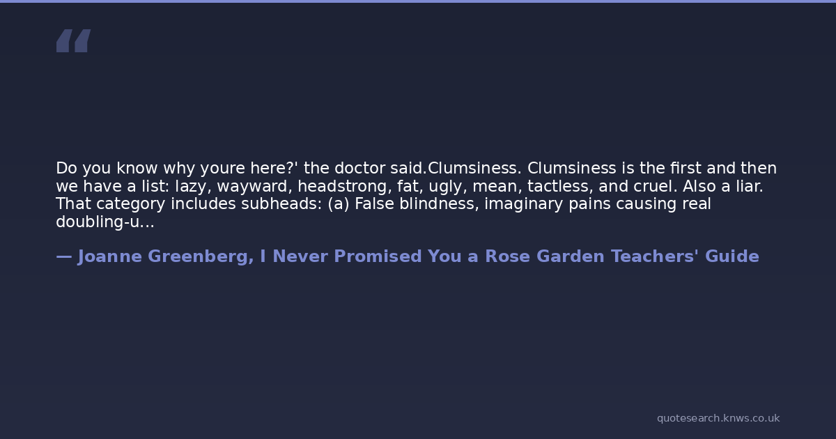 Do you know why youre here?' the doctor said.Clumsiness. Clumsiness is the first and then we have a list: lazy, wayward, headstrong, fat, ugly, mean, tactless, and cruel. Also a liar. That category includes subheads: (a) False blindness, imaginary pains causing real doubling-up, untrue lapses of hearing, lying leg injuries, fake dizziness, and unproved and malicious malingering s; (b) Being a bad sport. Did I leave out unfriendliness?Also unfriendliness.