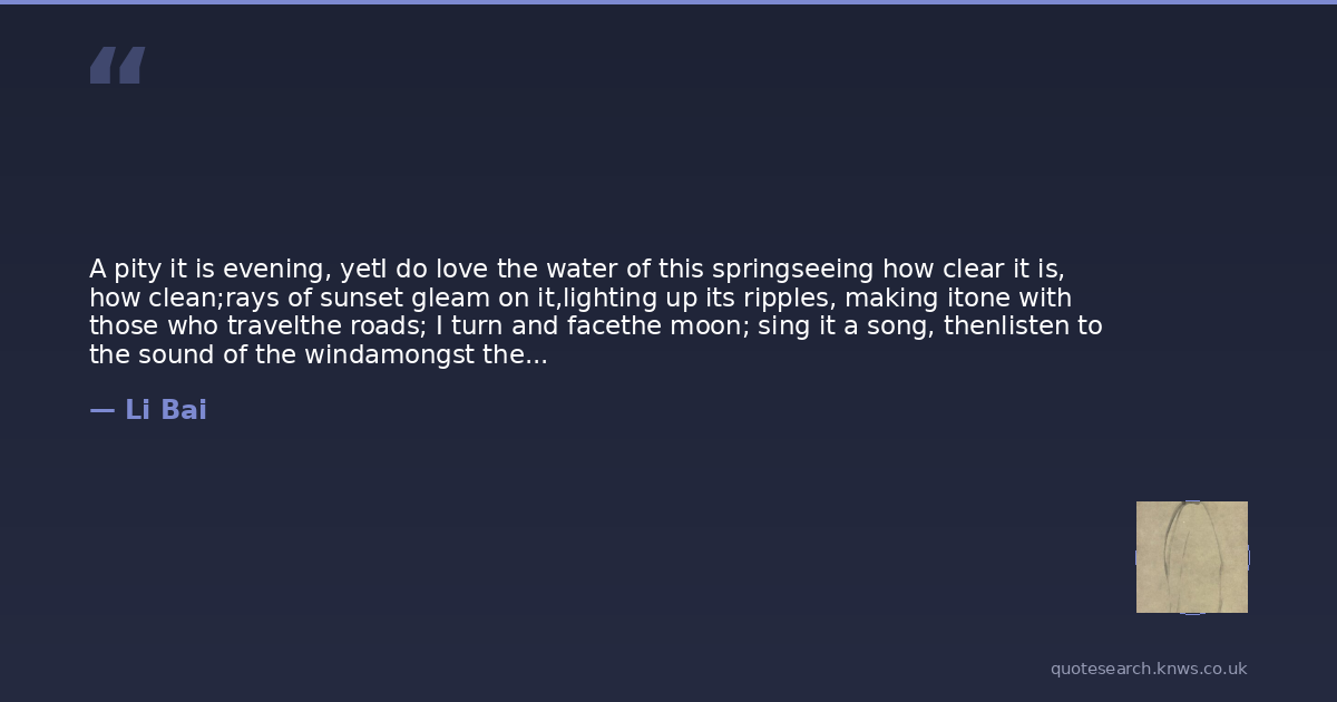 A pity it is evening, yetI do love the water of this springseeing how clear it is, how clean;rays of sunset gleam on it,lighting up its ripples, making itone with those who travelthe roads; I turn and facethe moon; sing it a song, thenlisten to the sound of the windamongst the pines.