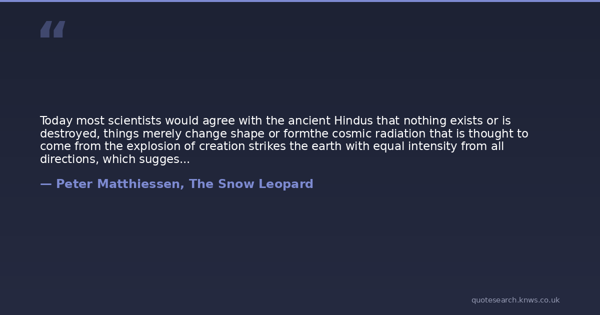 Today most scientists would agree with the ancient Hindus that nothing exists or is destroyed, things merely change shape or formthe cosmic radiation that is thought to come from the explosion of creation strikes the earth with equal intensity from all directions, which suggests either that the earth is at the center of the universe, as in our innocence we once supposed, or that the known universe has no center.