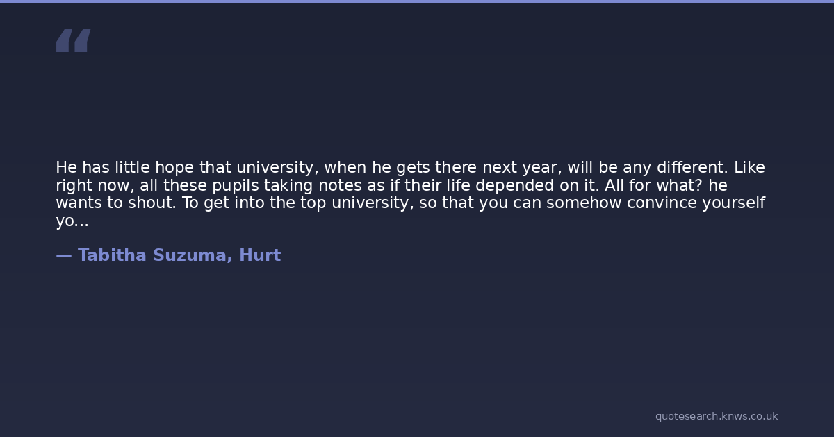 He has little hope that university, when he gets there next year, will be any different. Like right now, all these pupils taking notes as if their life depended on it. All for what? he wants to shout. To get into the top university, so that you can somehow convince yourself you are better than the great unwashed? So that your parents can convince themselves that they are better parents than the great unwashed? So that Mum and Dads fourteen-hour days at the office, paying for a fucking private education you never asked for, wasnt just a pathetic waste of a life?