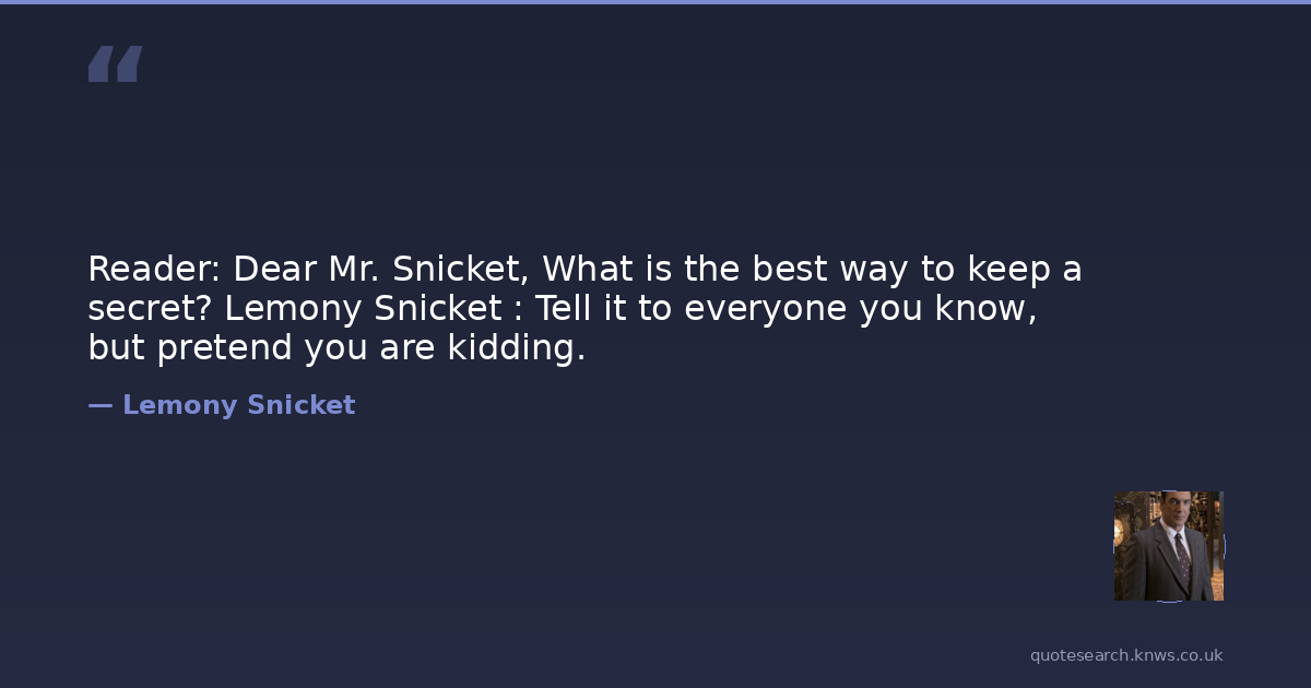Reader: Dear Mr. Snicket, What is the best way to keep a secret? Lemony Snicket : Tell it to everyone you know, but pretend you are kidding.