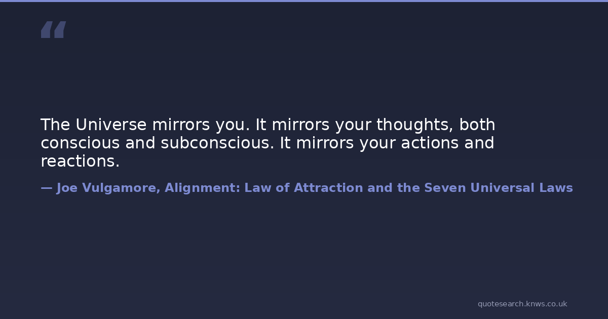 The Universe mirrors you. It mirrors your thoughts, both conscious and subconscious. It mirrors your actions and reactions. law-of-attraction self-help spirituality Download Image Share on X Share on Facebook Copy Link