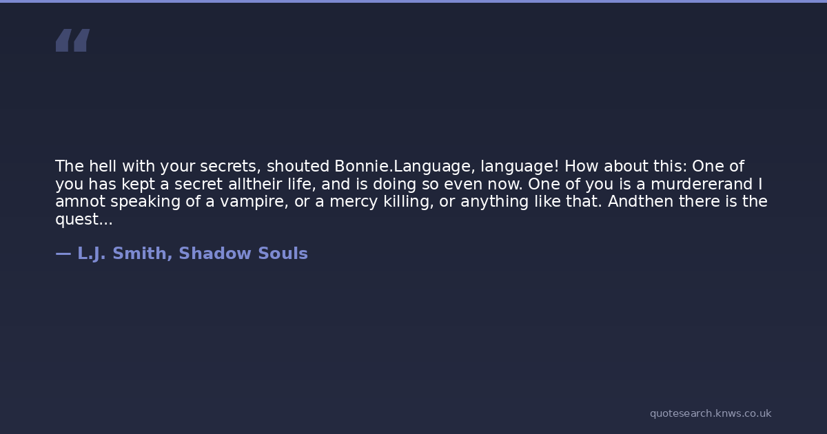 The hell with your secrets, shouted Bonnie.Language, language! How about this: One of you has kept a secret alltheir life, and is doing so even now. One of you is a murdererand I amnot speaking of a vampire, or a mercy killing, or anything like that. Andthen there is the question of the true identity of Sagegood luck on yourresearch there!One of you has already had their memory erasedand I dont meanDamon or Stefan. And what about the secret, stolen kiss? And then there isthe question of what happened the night of the motel, that it seems that nobodybut Elena can recall. You might ask her sometime about her theories aboutCamelot.