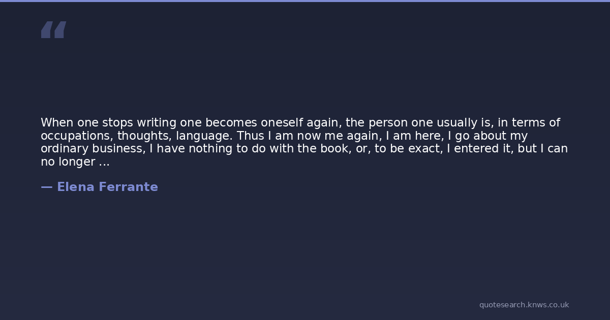 When one stops writing one becomes oneself again, the person one usually is, in terms of occupations, thoughts, language. Thus I am now me again, I am here, I go about my ordinary business, I have nothing to do with the book, or, to be exact, I entered it, but I can no longer enter it.