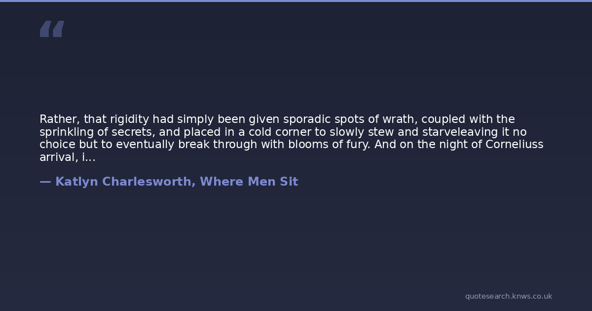 Rather, that rigidity had simply been given sporadic spots of wrath, coupled with the sprinkling of secrets, and placed in a cold corner to slowly stew and starveleaving it no choice but to eventually break through with blooms of fury. And on the night of Corneliuss arrival, it at long last broke through.