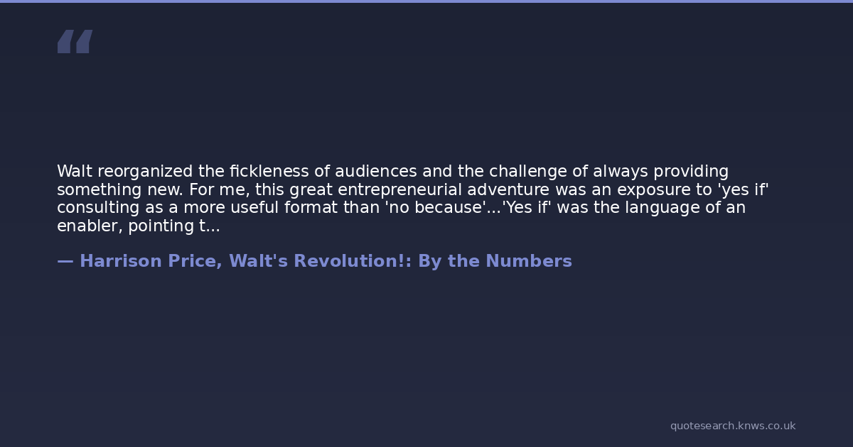 Walt reorganized the fickleness of audiences and the challenge of always providing something new. For me, this great entrepreneurial adventure was an exposure to 'yes if' consulting as a more useful format than 'no because'...'Yes if' was the language of an enabler, pointing to what needed to be done to make the possible plausible. Walt liked this language. 'No because' is the language of a deal killer. 'Yes if' is the approach of a deal maker. Creative people thrive on 'yes if'.