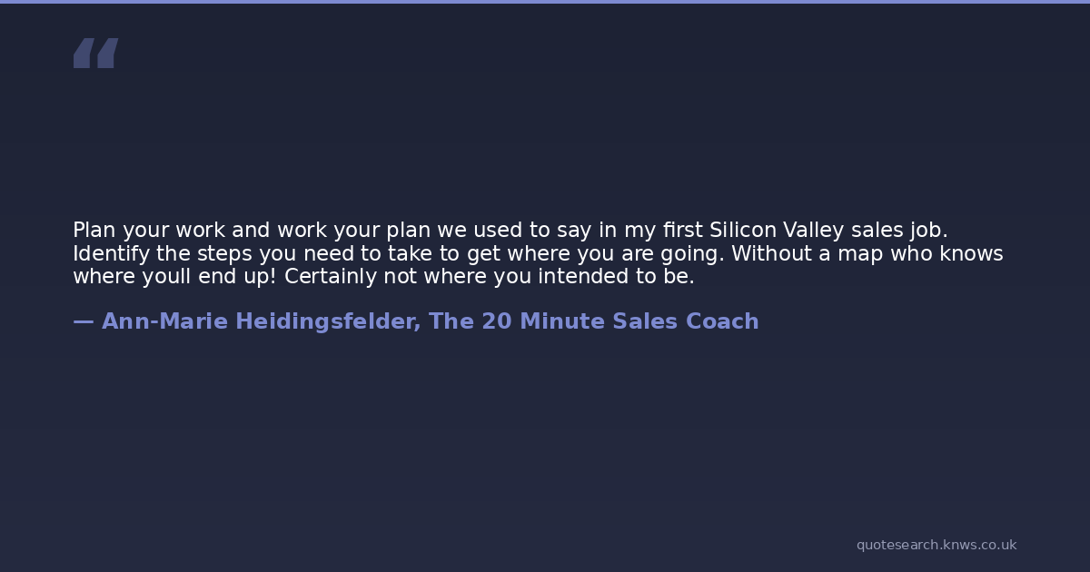Plan your work and work your plan we used to say in my first Silicon Valley sales job. Identify the steps you need to take to get where you are going. Without a map who knows where youll end up! Certainly not where you intended to be.